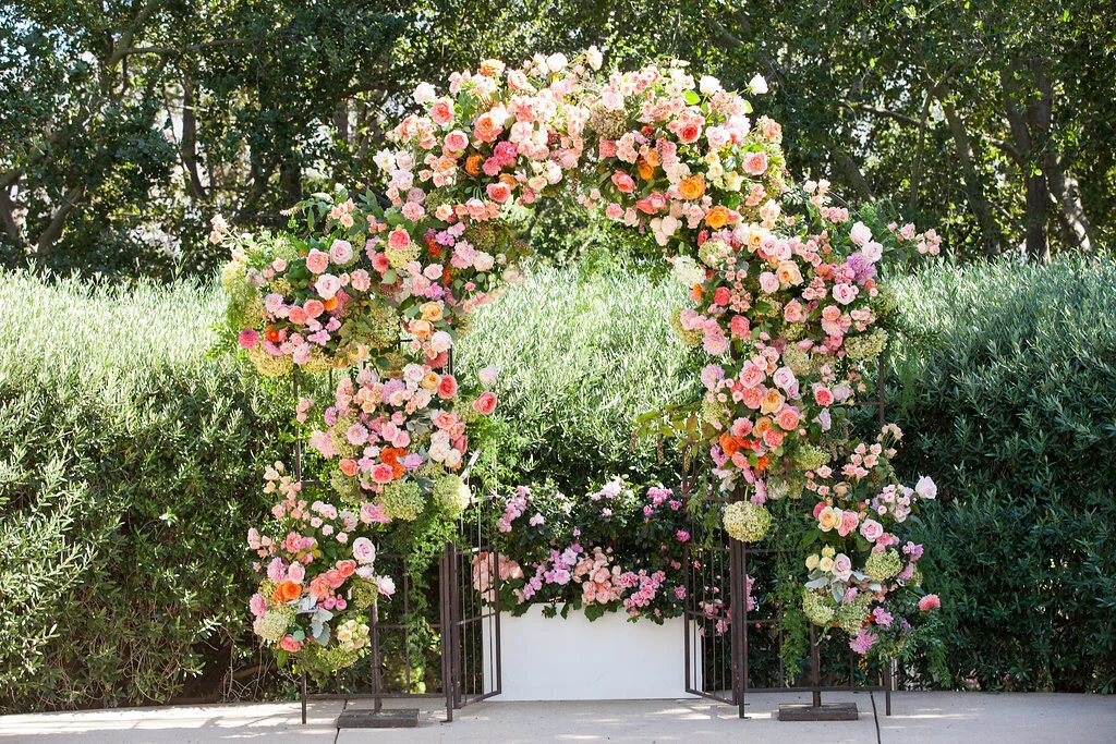 This bride knew she wanted lots of bright color incorporated into her big day and the Maravilla Gardens outdoor wedding venue, with its natural beauty, made for her perfect wedding location. The bride chose an elegant wedding ball gown with full tulle skirt and paired with a classic cathedral length veil. The Santa Barbara wedding florists at Louloudi Design created a lavish and lush coral and orange wedding arch for the ceremony which later became the focal point for the outdoor reception as well. Elegant church pews featured petite floral accents, and overhead, white wedding drapery provided shade for guests as they watched the couple walk down the ceremony aisle and recite their vows with the help of their wedding officiant.