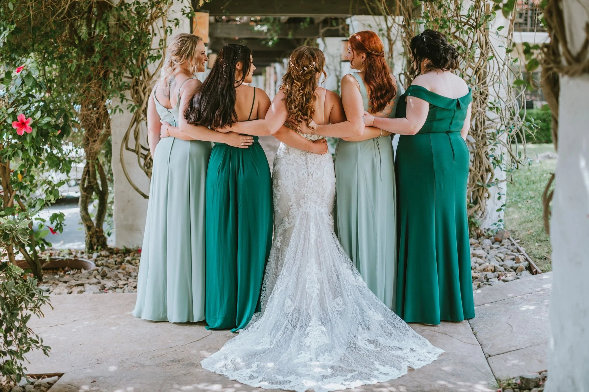 Walking up to Taylor and Zachary's wedding, the love in the air-- and in the details-- was palpable. The couple had selected two lush, greenery rich locations for their special day: The Westlake Village Inn for getting ready and the Calamigos Ranch Redwood Room for their ceremony and reception. The beautiful Southern California weather was the only sign this event was in Malibu, CA instead of a secret, fairytale forest. As the bride walked down the aisle in a chic lace Maggie Sottero gown and lace edged cathedral length veil, her backdrop was a babbling waterfall and sunlight trees. Once at the altar, the couple was surrounded by dreamy white drapery, abundant greenery with pops of white and orange elegantly arranged by The Exotic Green Garden, and of course, a bridal party decked in gorgeous shades of green.