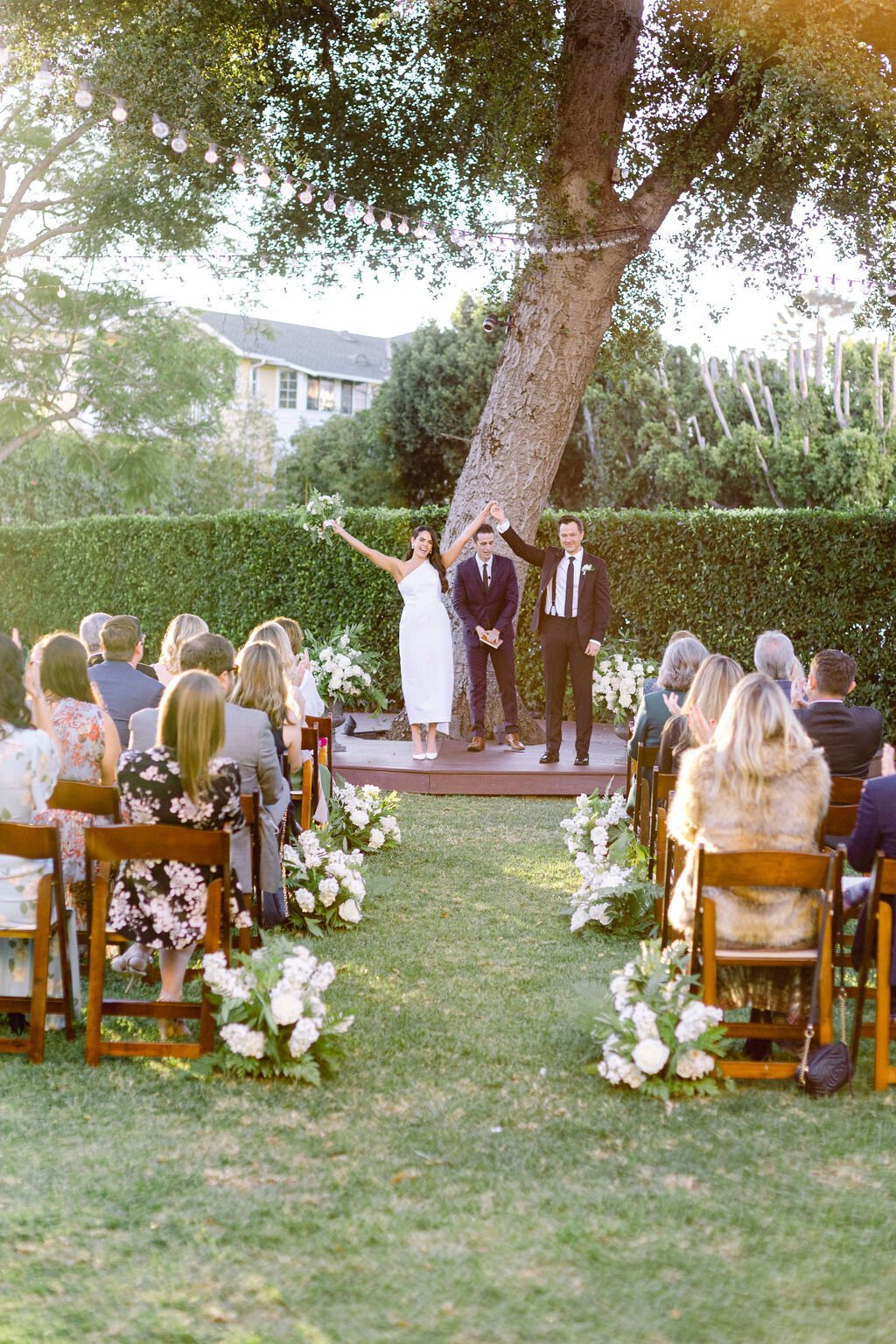For William and Jennie’s big day, they selected the Santa Barbara Club’s garden oasis as the venue for their intimate ceremony. The bride wore a fitted and sleek, one-shoulder gown and the groom went with a classic black and white look, complete with suspenders. The pair met up for a tender first look before meeting their guests in the garden.