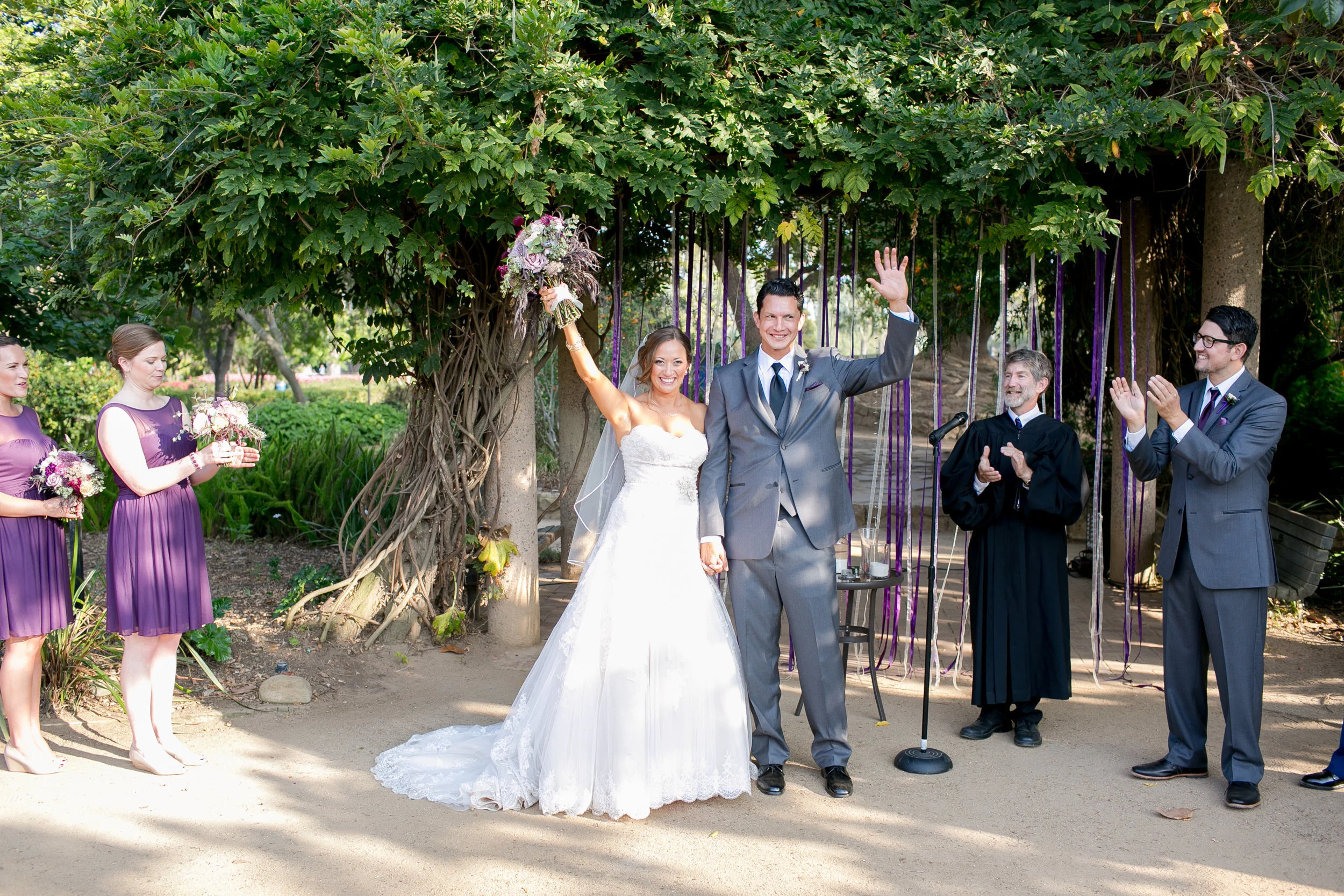 This bride and groom chose to hold their ceremony at Alice Keck Park, a beautiful Santa Barbara wedding destination. The ladies wore purple, knee length bridesmaid gowns and carried floral bouquets crafted by the ever talented Santa Barbara wedding florist Margaret Joan Florals. During the ceremony, the couple strung different shades of purple wedding ribbons behind them creating a fun backdrop as Santa Barbara wedding officiant Rich Tobin led the couple through their vows. Wedding musician Guitar Witt softly played throughout the ceremony which added to the park’s natural ambiance.