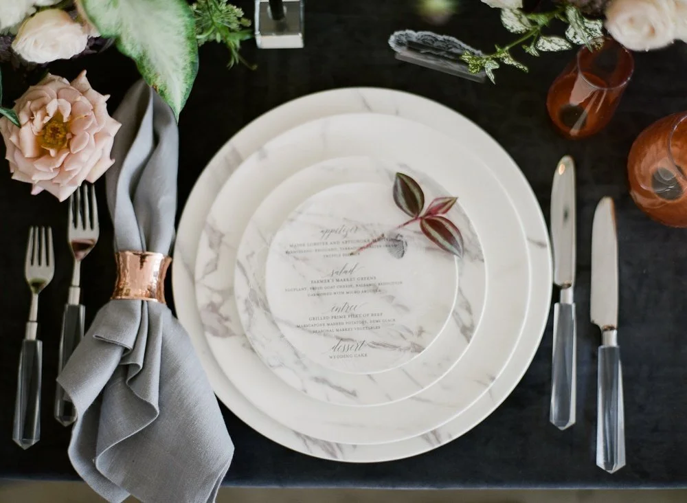 We hope you enjoy this modern-styled wedding which mixes copper elements and different shades of gray, all captured by wedding photographer Kristen Beinke. Santa Barbara design studio Lazaro Press created eye-catching wedding stationary for the day which meshed perfectly with blush and white flower arrangements from Camellia Floral Design. The reception table’s black tablecloth and black candlesticks were offset by white marble-style plates, light grey wedding napkins, and glasses with copper detailing. The Ark Rentals, Revelry Event Designers, and La Tavola Fine Linens helped to make the styled reception table come to life.