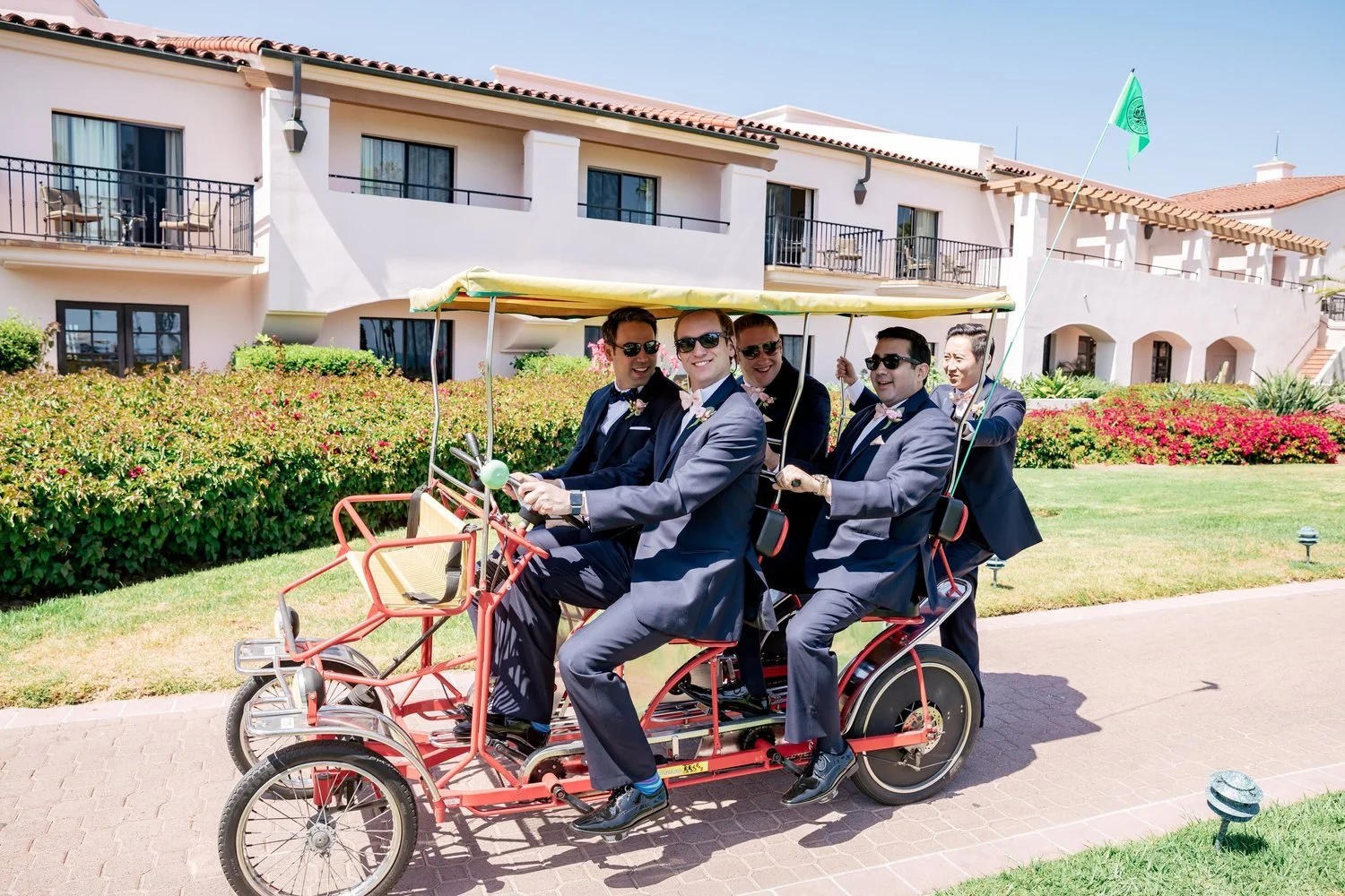 This groom and his groomsmen took a quick spin on a double surrey bike on the morning of his wedding. The day at the Hilton Santa Barbara Beachfront Resort was full of fun surprises like this, also including a live painter at the ceremony and a shower of gold confetti to end the night.