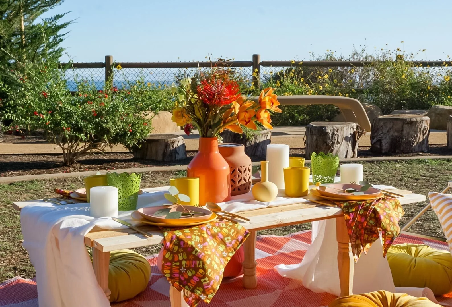 Boho Sunrise Party Box - This option exudes good vibes with vibrant yellow, orange, and pink place settings, lanterns, vases, and other decor.