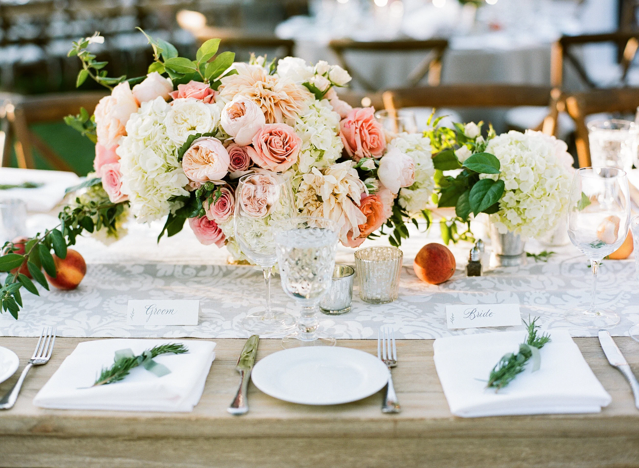 For the color palette at this outdoor Santa Barbara wedding, the couple chose classic wedding white, paired with pops of bright peach and pink. Indeed, even actual peaches were used as additional wedding decor on the reception tables! Guests were seated at a mix of long farmhouse tables from The Tent Merchant, a Santa Barbara event rental company, and draped round tables featured La Tavola wedding linens. New West Catering, experts in occasions and wedding catering, served a wedding menu with local flavor, and Enjoy Cupcakes provided a drool-worthy spread for dessert, including chocolate chip cookie dough, cinnamon toast, strawberries and cream, and blueberry sweet corn and honey wedding cupcakes.