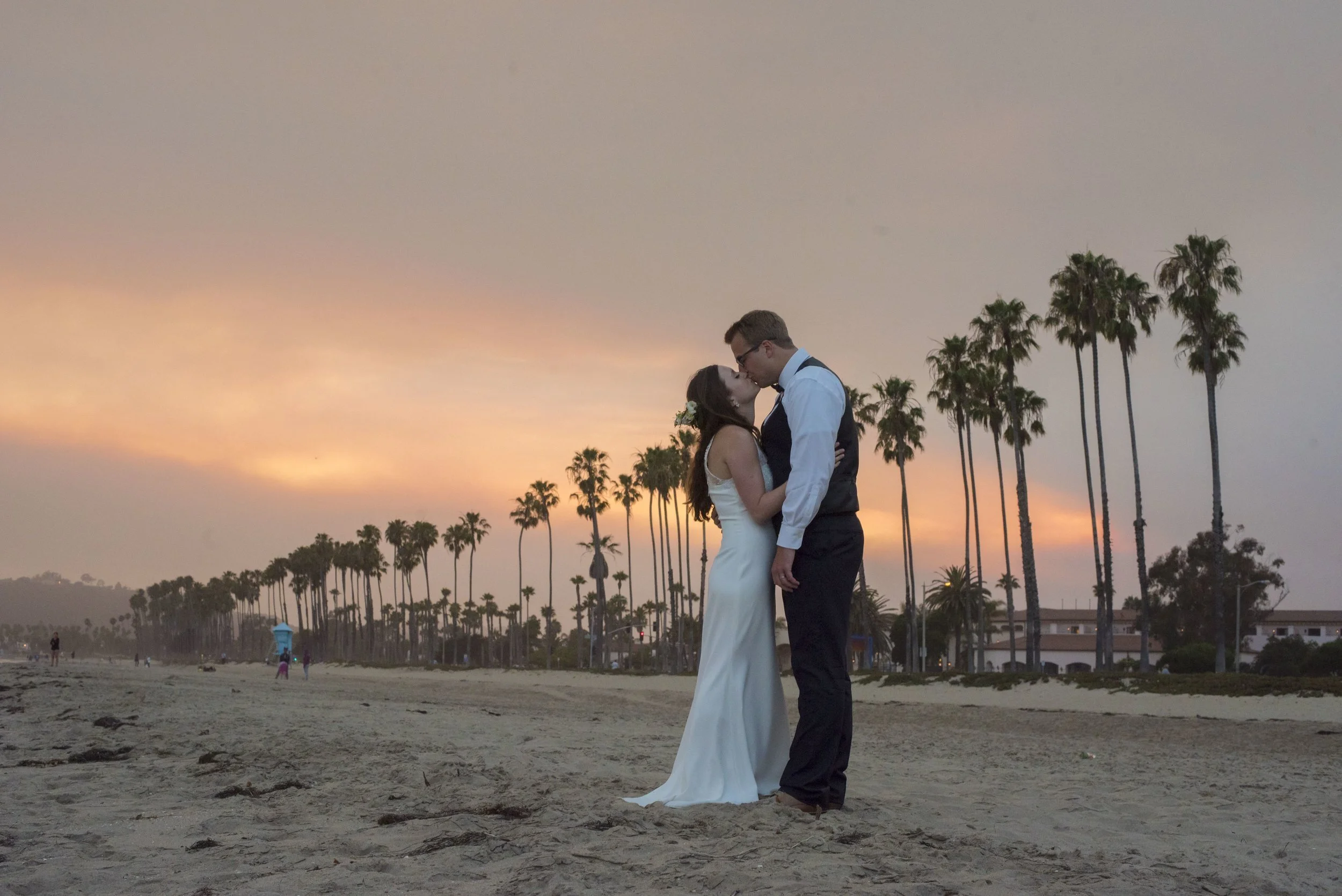 White wedding chairs faced a floral-covered arch surrounded by palm trees for the ceremony. After the outdoor ceremony, officiated by Barbra Mousouris of I Do Santa Barbara, the cocktail hour was serenaded by music from Gavin Roy Presents.