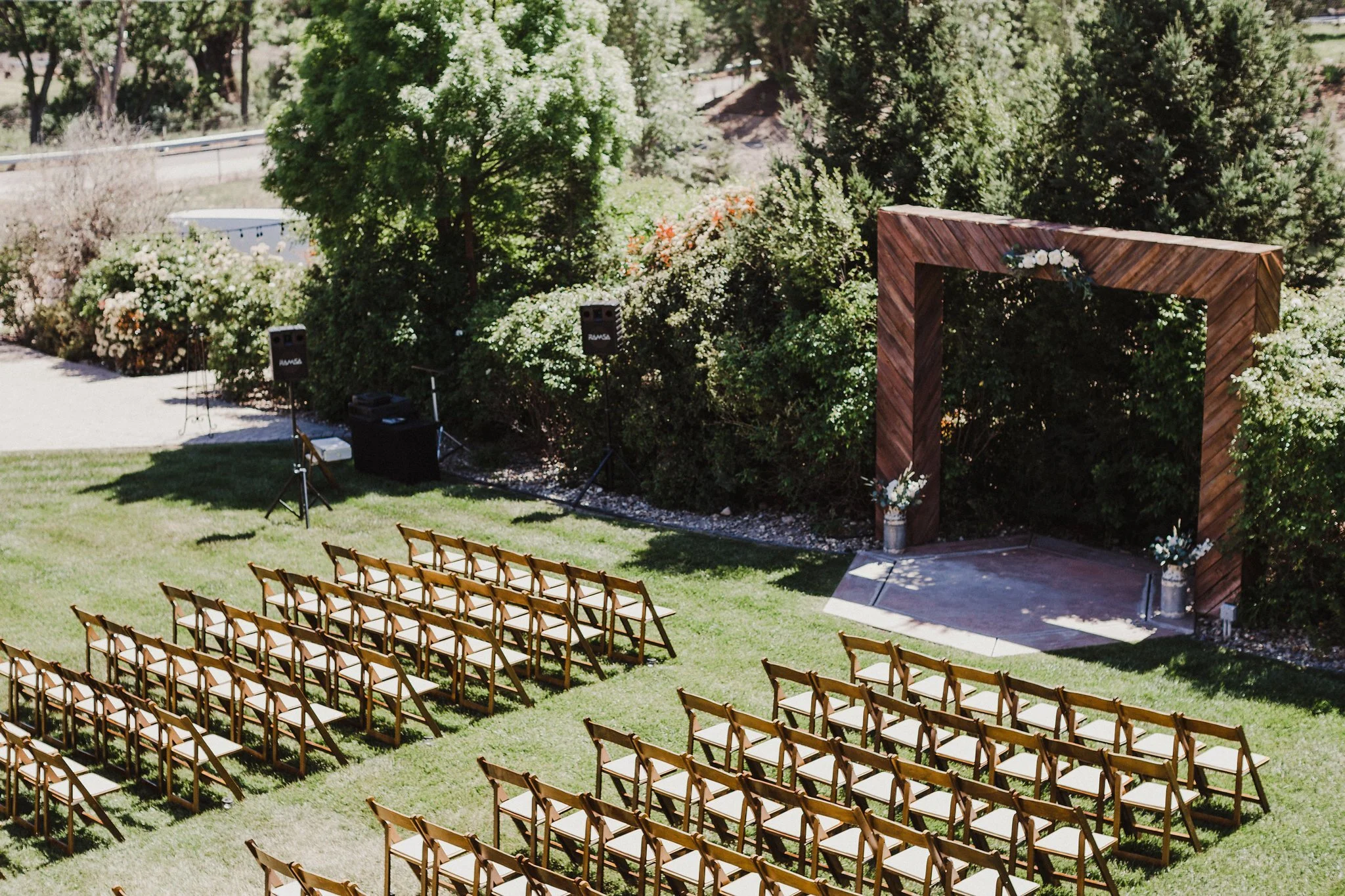 When it was ceremony time, the bride walked onto the lawn accompanied by her father and met her husband-to-be under the modern wood arch. Florals for the event were kept simple in natural green and white hues.