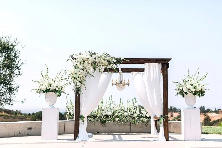 The decor is elegant but simple with white florals and long, leafy garlands that accentuate the historical charm of two iconic Santa Barbara venues